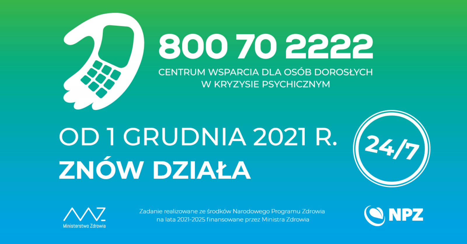 Od 1 grudnia 2021 r. wznowiło swoja działalność CENTRUM WSPARCIA DLA OSÓB DOROSŁYCH W STANIE KRYZYSU PSYCHICZNEGO. W ramach projektu oferowane jest całodobowe, profesjonalne wsparcie psychologiczne oraz kontakt ze specjalistami. Zadanie, zaplanowane na okres 5 lat realizowane jest ze środków Narodowego Programu Zdrowia na lata 2021-2025 i finansowane przez Ministra Zdrowia.