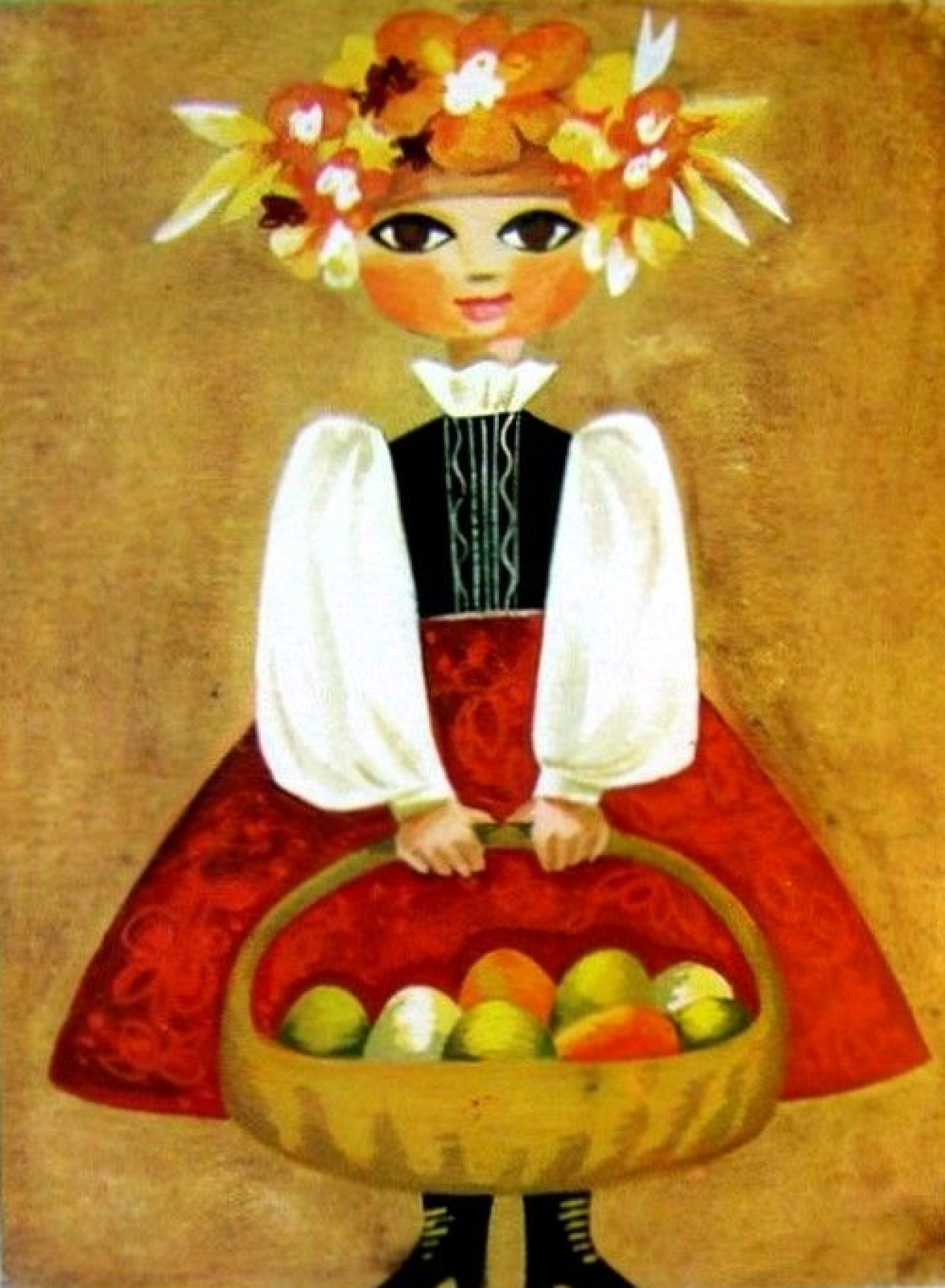 Dziewczynka w stroju tradycyjnym trzymająca koszyk z kolorowymi jajkami
